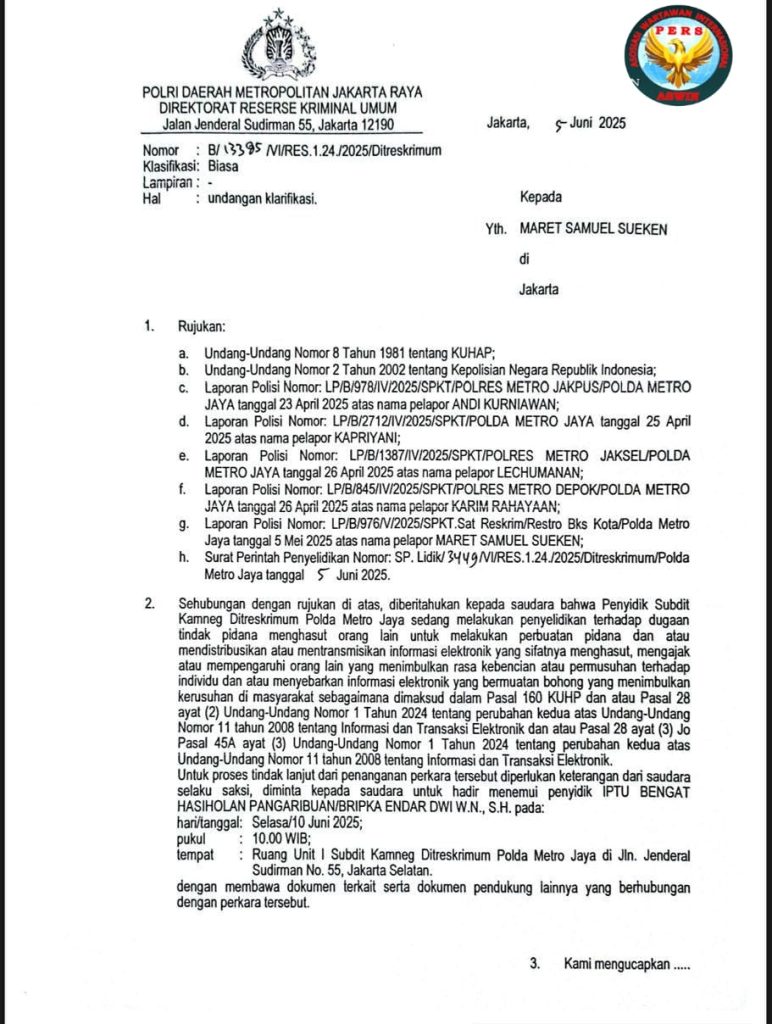 “I received a summons from the Metro Jaya Police for further clarification regarding the report I filed under Police Report No: LP/B/976/V/2025/SPKT. Sat Reskrim/Restro Bks Kota/Polda Metro Jaya dated May 5, 2025,” Samuel stated.