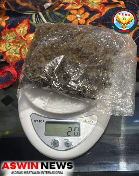 Dalam penggeledahan, petugas menemukan satu bungkus ganja dengan berat bruto sekitar 20 gram, yang disembunyikan di bawah telapak sepatu sebelah kiri milik pelaku. Selain itu, turut diamankan satu unit handphone Redmi 10 warna biru sebagai barang bukti pendukung.