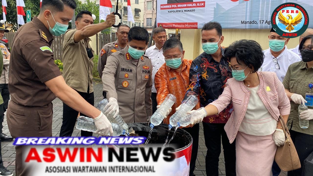 MANADO, ASWINNEWS.COM – Ribuan liter minuman keras ilegal jenis Cap Tikus dan ribuan butir obat keras tanpa izin resmi dimusnahkan Polresta Manado pada Kamis (7/8/2025). Pemusnahan ini merupakan hasil operasi rutin yang ditingkatkan sejak Januari hingga Juli 2025, disaksikan langsung oleh Forkopimda dan tamu undangan.
