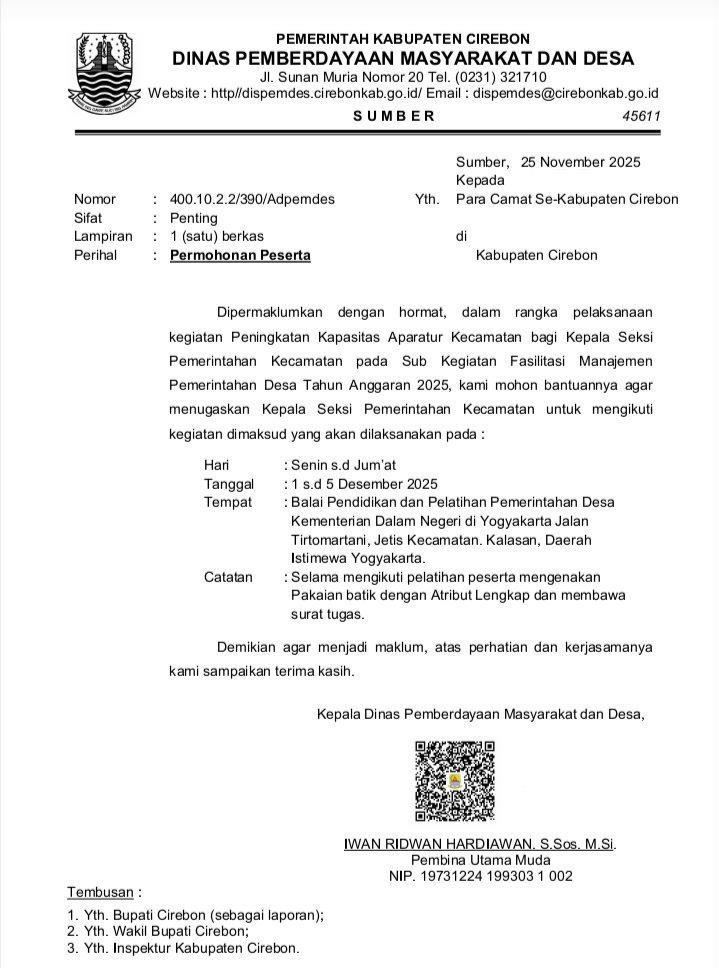 Cirebon – AswinNews.com — Pemerintah Kabupaten Cirebon melalui Dinas Pemberdayaan Masyarakat dan Desa (DPMD) menginstruksikan seluruh camat untuk menugaskan Kepala Seksi (Kasi) Pemerintahan Kecamatan mengikuti kegiatan peningkatan kapasitas aparatur yang dijadwalkan berlangsung pada 1–5 Desember 2025.
