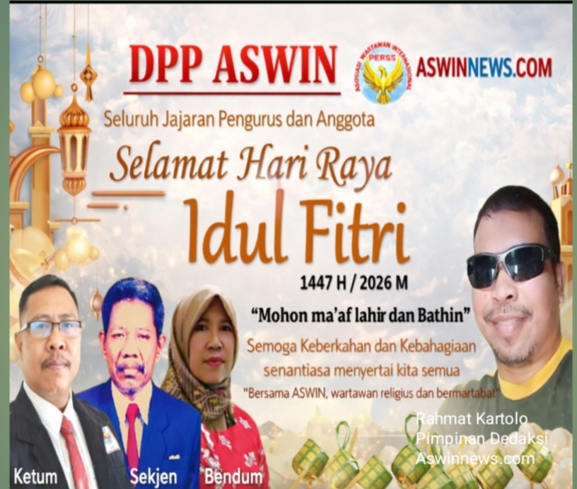 Jakarta, Aswinnews.com — Dalam rangka menyambut Hari Raya Idul Fitri 1 Syawal 1447 Hijriah yang bertepatan dengan 21 Maret 2026 Masehi, Dewan Pimpinan Pusat (DPP) Asosiasi Wartawan Indonesia (ASWIN) bersama Media Aswinnews.com menyampaikan ucapan selamat kepada seluruh umat Muslim.