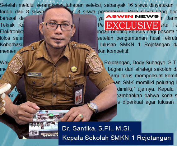 Setelah melalui serangkaian tahapan seleksi, sebanyak 16 siswa dinyatakan lolos, terdiri dari 8 siswa laki-laki dan 8 siswa perempuan. Para siswa yang berhasil berasal dari beragam program keahlian, yakni Teknik Komputer dan Jaringan, Teknik Kendaraan Ringan, Manajemen Perkantoran, Akuntansi, serta Teknik Elektronika Industri. Kegiatan dilanjutkan dengan briefing khusus bagi peserta yang lolos seleksi, yang dilaksanakan segera setelah pengumuman hasil rekrutmen. Keberhasilan ini menjadi bukti kesiapan lulusan SMKN 1 Rejotangan dalam memenuhi kebutuhan dunia kerja yang semakin kompetitif.