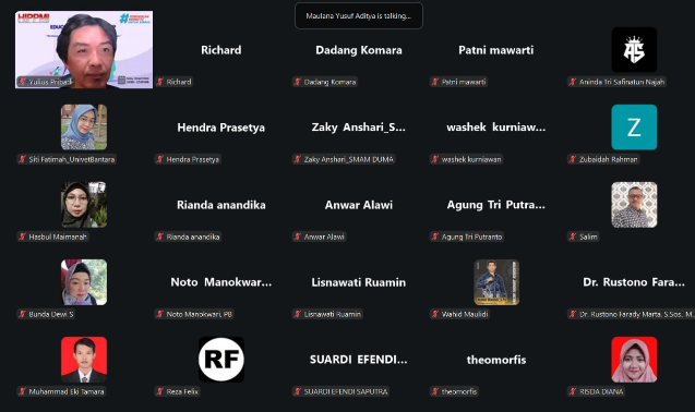 Webinar berlangsung interaktif dengan sesi diskusi dan tanya jawab yang dipandu Maulana Yusuf Aditya, S.Pd., M.Pd. Peserta tampak antusias mengikuti jalannya acara.
